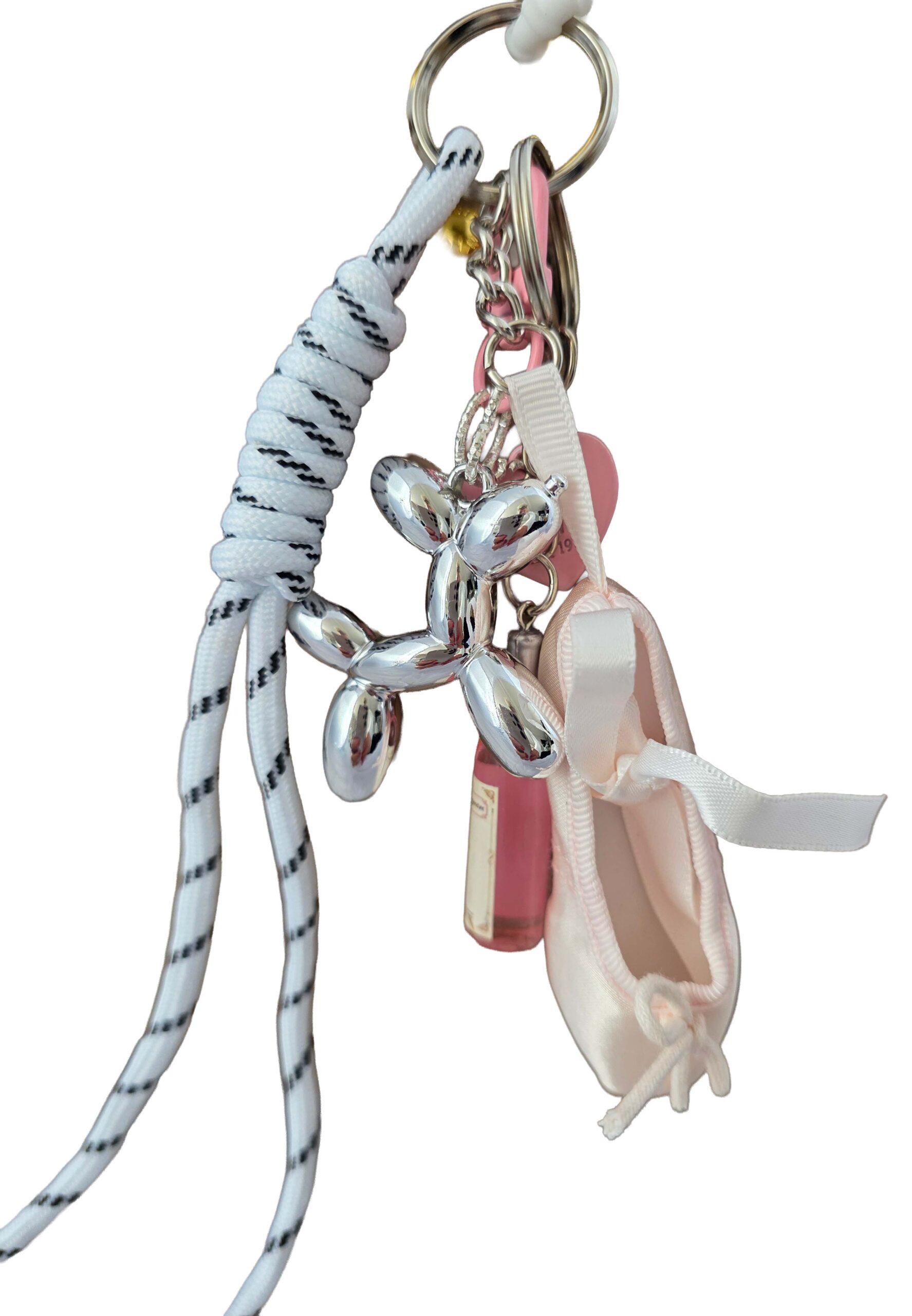 Na uren op spitzen mag je best een glaasje. Blush & Ballet is een tassenhanger met een verhaal: een zachte satijnen ballerina (met zichtbaar ‘doorleefde’ tenen 😉), een fonkelende zilveren ballonhond en een mini-flesje wijn – voor de après-pas-de-deux. Afgewerkt met een stoer koord en chique details. Perfect voor wie krachtig danst door het leven, maar ook weet wanneer het tijd is voor een toost. Santé!