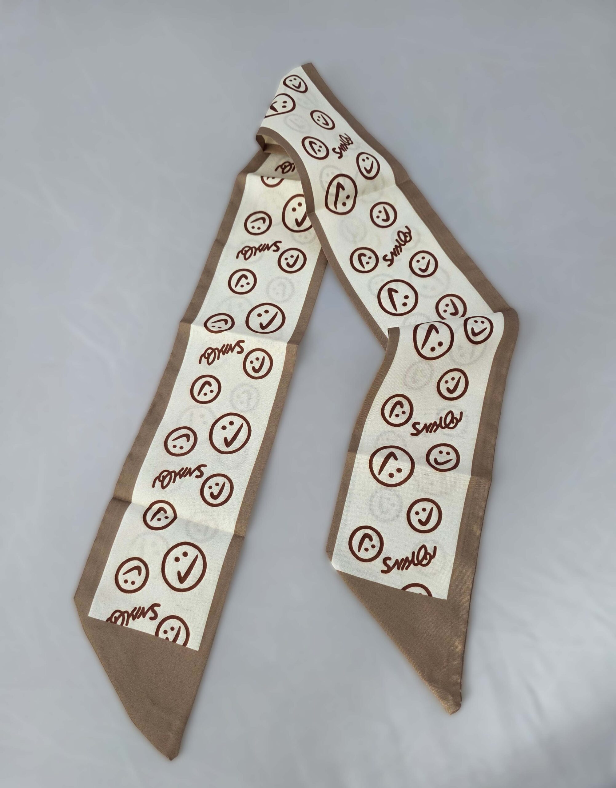 Mood swings, maar dan fashionable 😄 Deze beige twilly met bruine smileys laat je humeur letterlijk zien! Of je nu zin hebt in een big smile of even een meh-dagje hebt, met deze sjaal voeg je altijd een dosis persoonlijkheid toe aan je tas, hoed of haar.